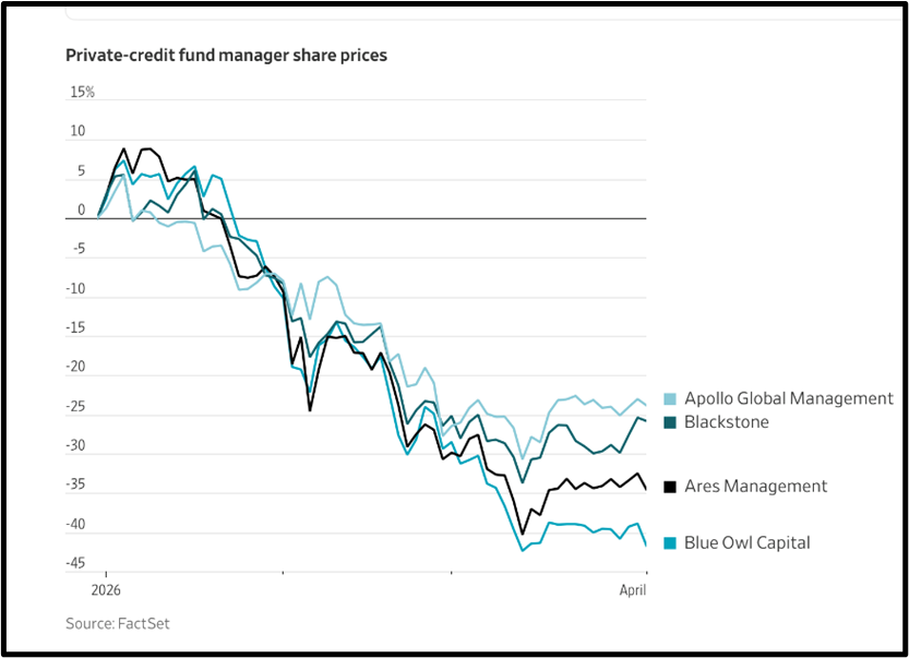 A Big Concern. We have been writing about private debt for some time. The private credit market is now a $1.5 trillion market, the same relative size as the credit markets that sub-prime was when it crashed the market. The market is as big as the syndicated bank loan market. Blue Owl has been the poster child. Amid a scramble to meet redemptions and then restricting them, the stock has dropped by 40%. Rising interest rates, lower bond prices and forced selling due to redemptions magnify the issue into a run on the “bank.” The Treasury Department called a meeting with regulators to discuss risks in the private credit sector amid pushes to include it in 401(k) plans. Investors have requested to withdraw $5.4 billion from two Blue Owl Capital private credit funds. Redemptions are now limited to 5%. The redemptions represented 22% of Blue Owl Capital’s $36 billion private credit fund and 41% of a technology-focused fund.